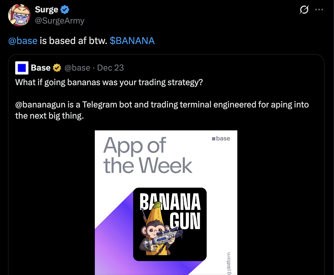 @SurgeArmy pointed out that Base named Banana Gun app of the week. No victory lap, just a screenshot and a “based af” comment, which honestly said enough on its own.